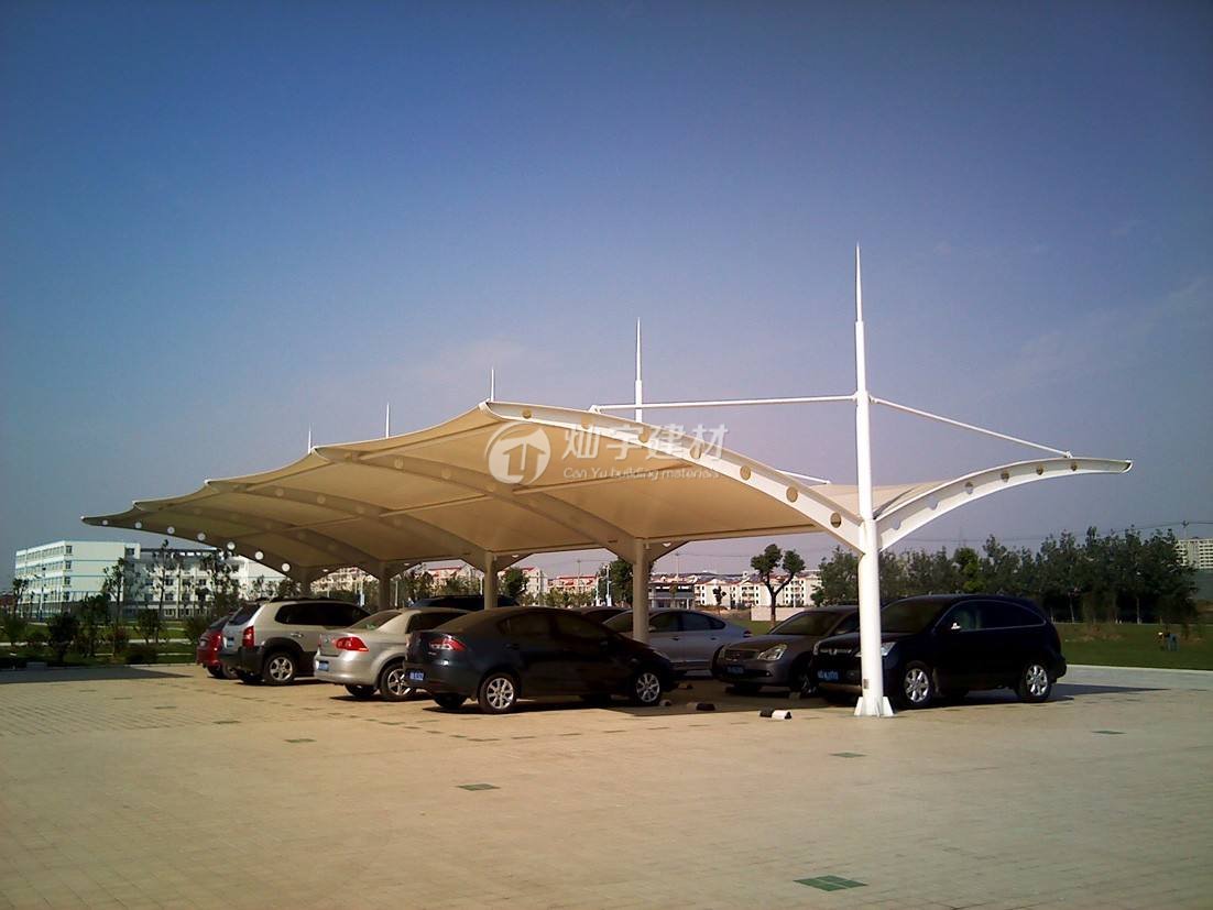 具有遮陽、擋雨、實用、美觀的作用。膜結構停車棚適用范圍:社區、學校、商業、體育館、工廠、政府機構等。膜結構停車棚可選材料有鋼材、鋼索、膜材料等。膜結構停車棚的結構形式是由多種高強薄膜材料及加強構件(鋼架、鋼柱或鋼索)通過一定方式使其內部產生一定的預張應力以形成某種空間形狀,作為覆蓋結構,并能承受一定的外荷載作用的一種空間結構形式。
